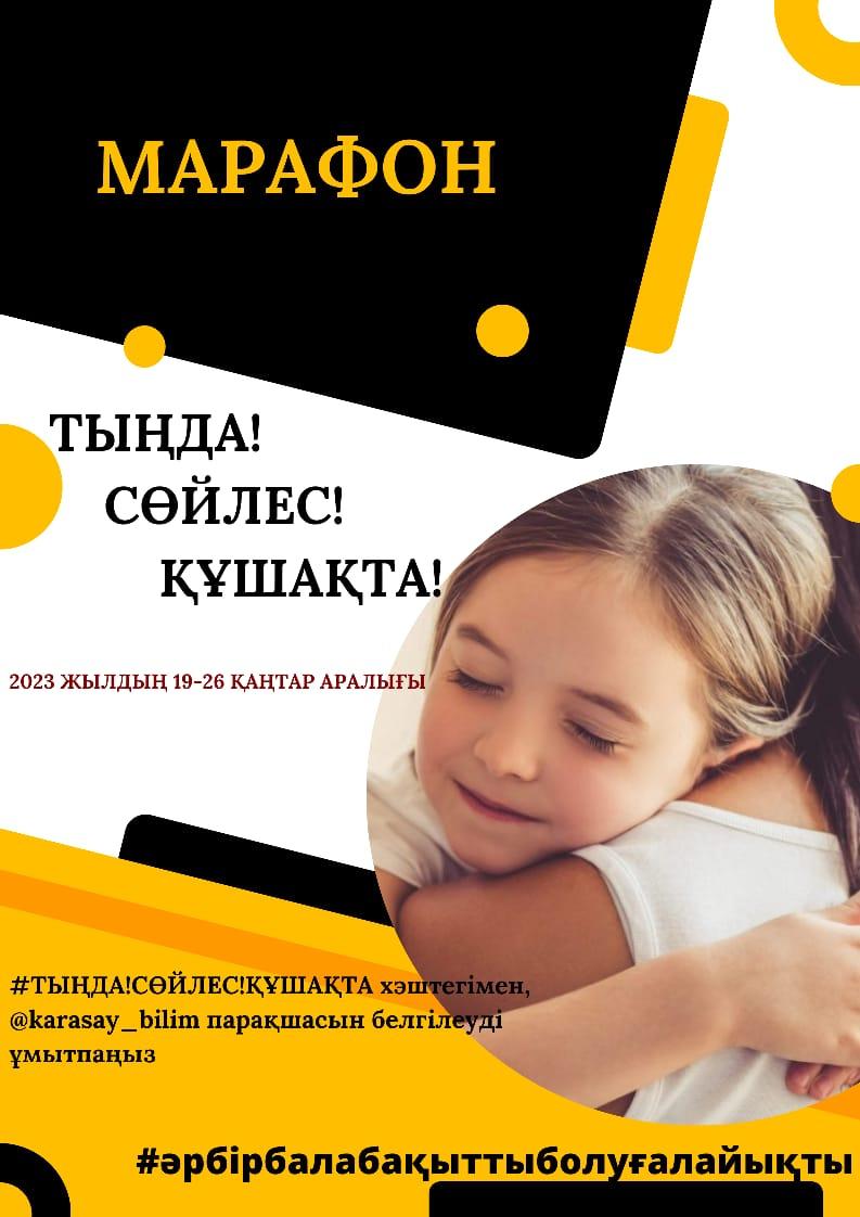 Масымхан Бейсебаев атындағы орта мектеп » Біз туралы » Мұғалімдер » Құрметті ата-аналар, "М.Бейсебаев атындағы орта мектебі" КММ-нің психолог мамандары мен сынып жетекшілердің ұйымдастыруымен "ТЫҢДА!СӨЙЛЕС! ҚҰШАҚТА! " тақырыбында марафон өткізілуде.Осы марафонға қатысуға шақырамыз!