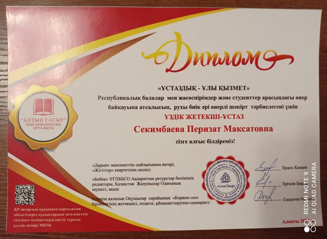 РЕСПУБЛИКАЛЫҚ балалар мен жасөспірімдер және студенттер арасындағы " “АРАЙЛЫ АЛТЫН КҮЗ" атты байқауда біздің мектебіміздің оқушылары жүлделі орындар иеленіп, Диплом және Кубоктармен марапатталды!!!🥳🥳🥳 Өнерлі балалардың жетекшілері Барибаева Гул » Масымхан Бейсебаев атындағы орта мектеп
