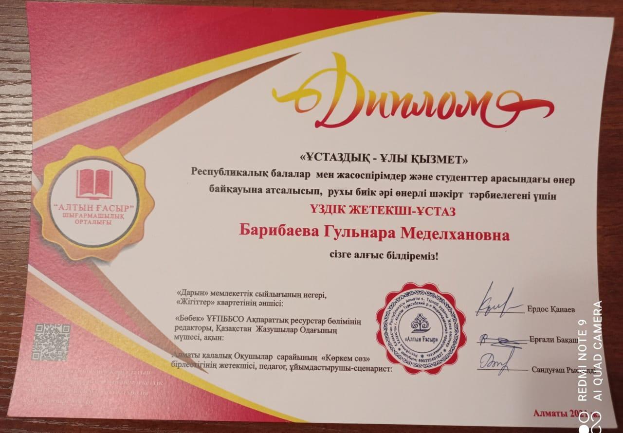 РЕСПУБЛИКАЛЫҚ балалар мен жасөспірімдер және студенттер арасындағы " “АРАЙЛЫ АЛТЫН КҮЗ" атты байқауда біздің мектебіміздің оқушылары жүлделі орындар иеленіп, Диплом және Кубоктармен марапатталды!!!🥳🥳🥳 Өнерлі балалардың жетекшілері Барибаева Гул