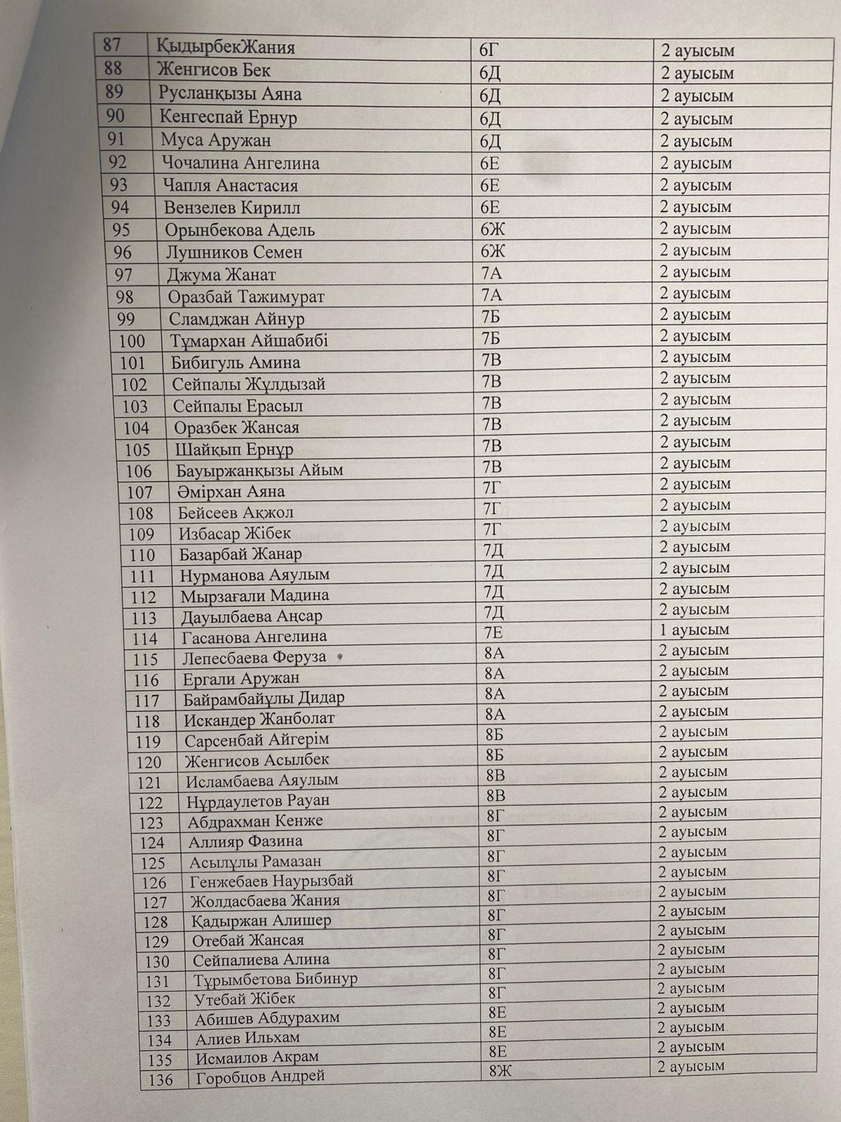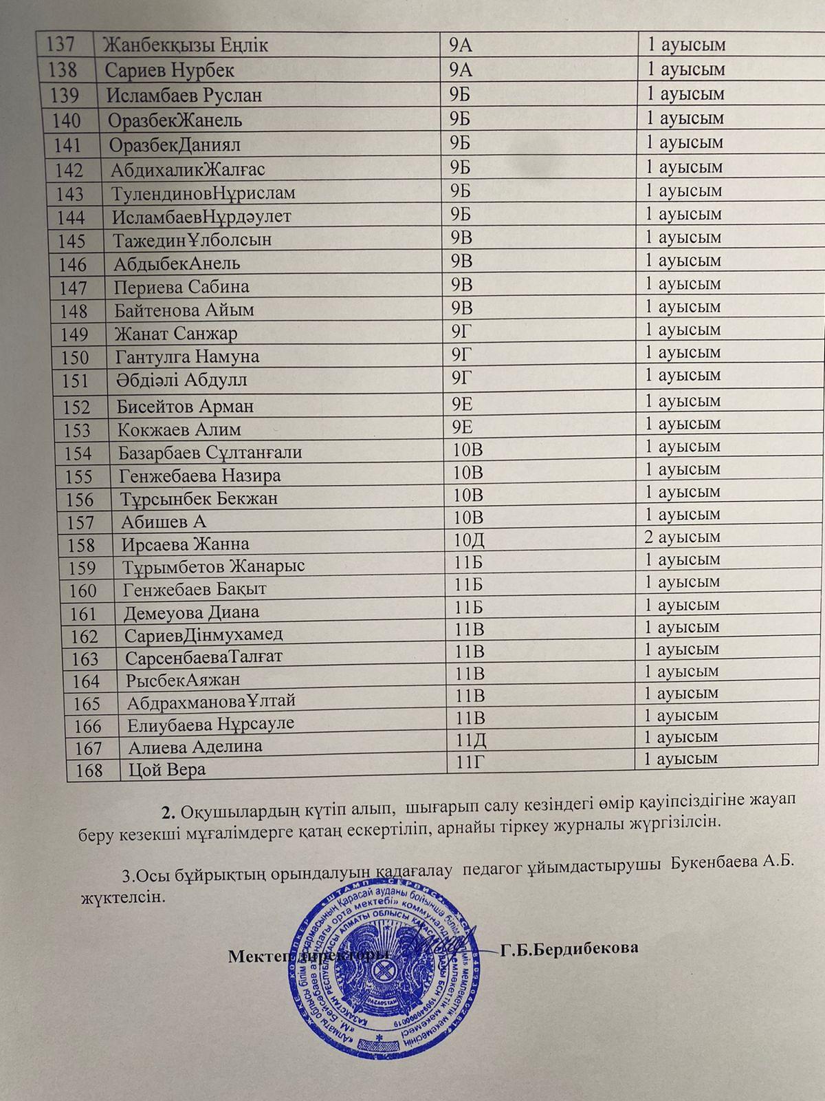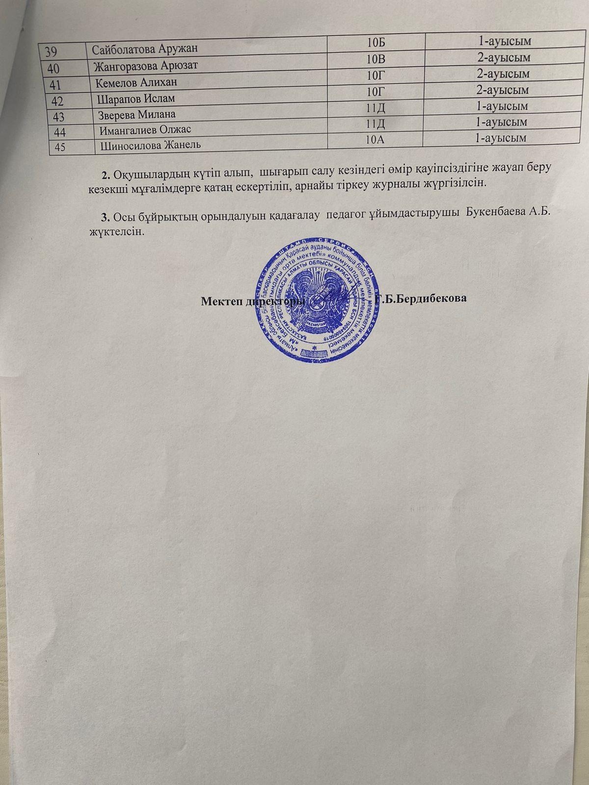 Оқушыларды тасымалдау үшін 18 орындықты және 50 орындықты екі автобус бөлінді. Оқушыларды күтіп алатын, мұғалімдер арасынан кезекшілік бекітілді.