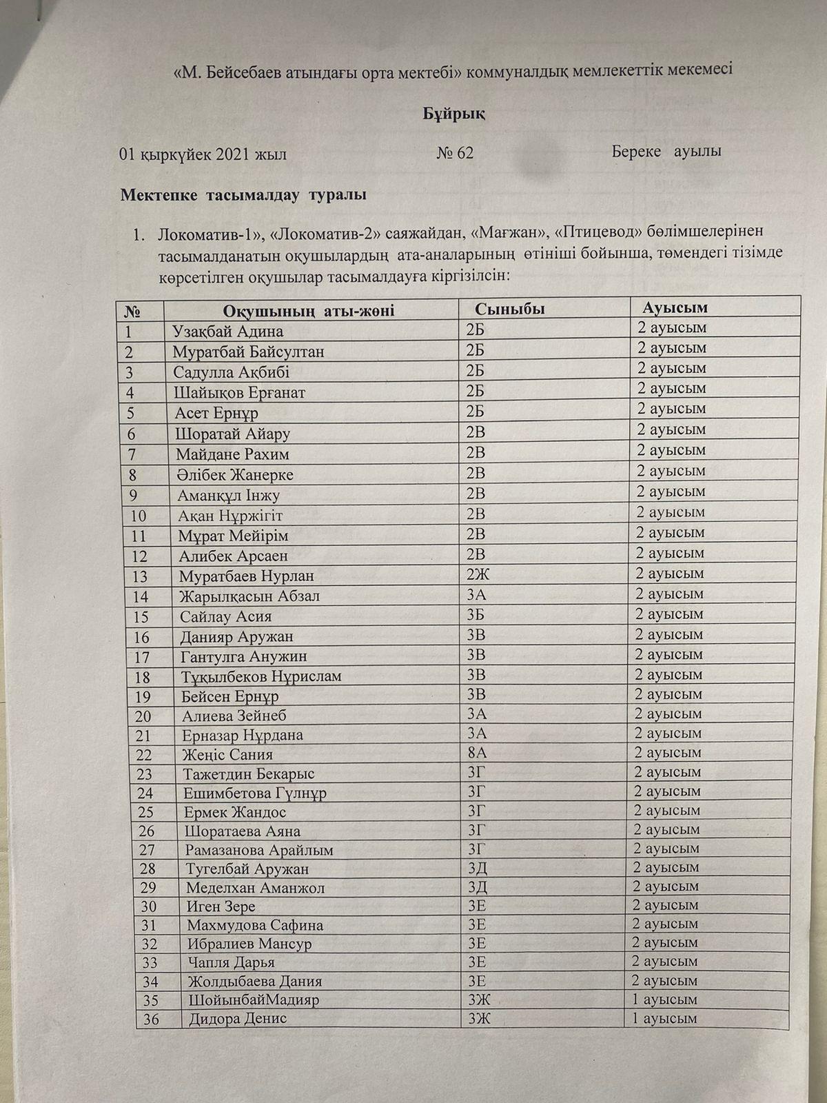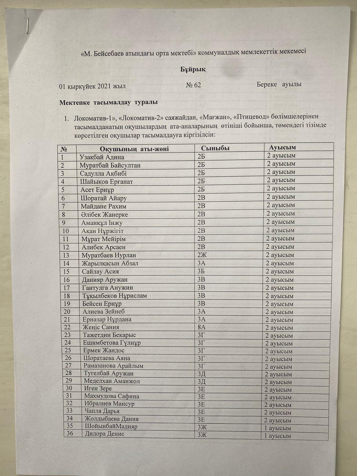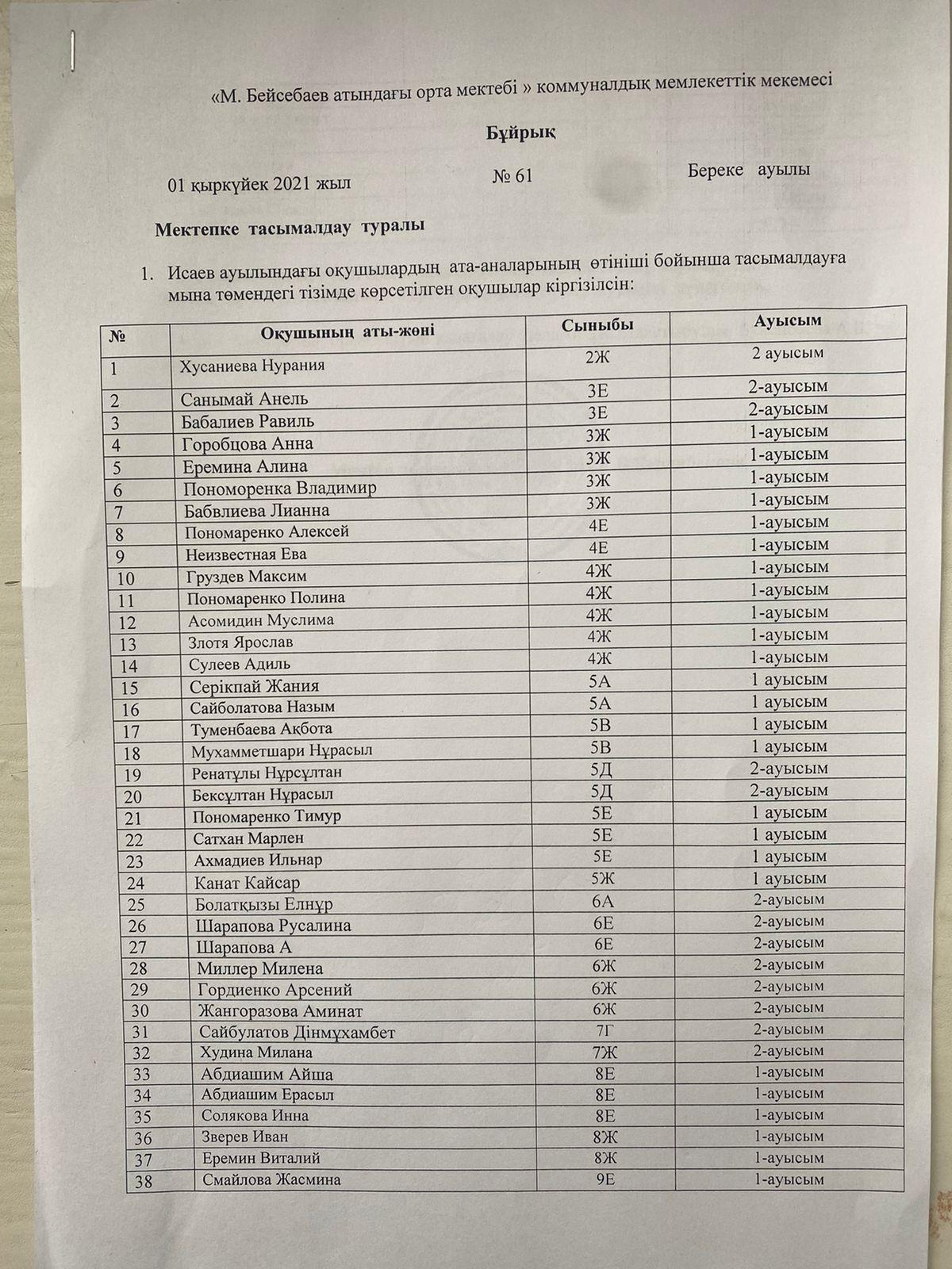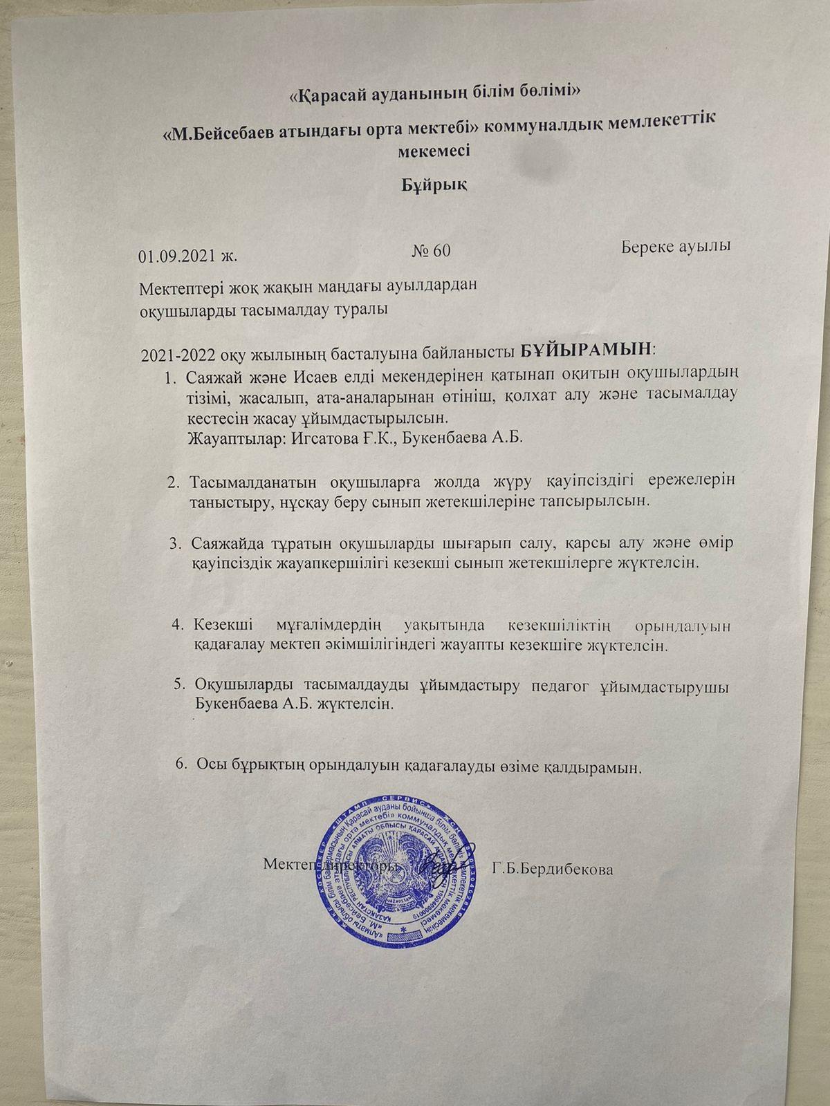 “М.Бейсебаев атындағы орта мектебі” КММ-де 2021-2022 оқу жылында 213 оқушы Исаев ауылы мен Саяжайлардан тасымалданады.