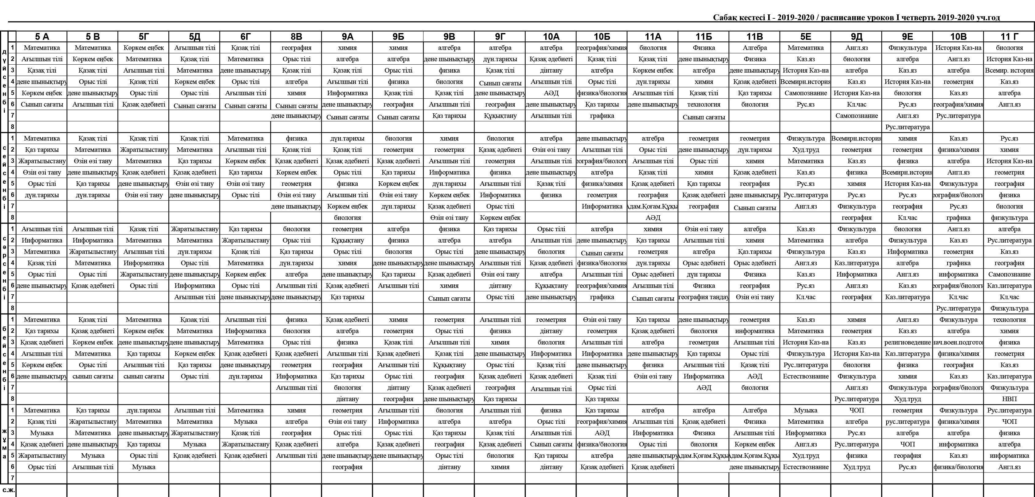 2019-2020 оқу жылы сабақ кестесі